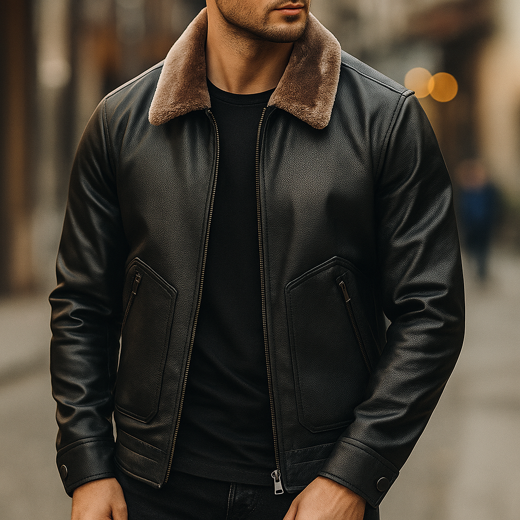Made for colder days, this classic genuine leather jacket features a plush fur interior and a softly structured fit that delivers lasting warmth without adding bulk, creating a refined layer that feels as luxurious as it looks.