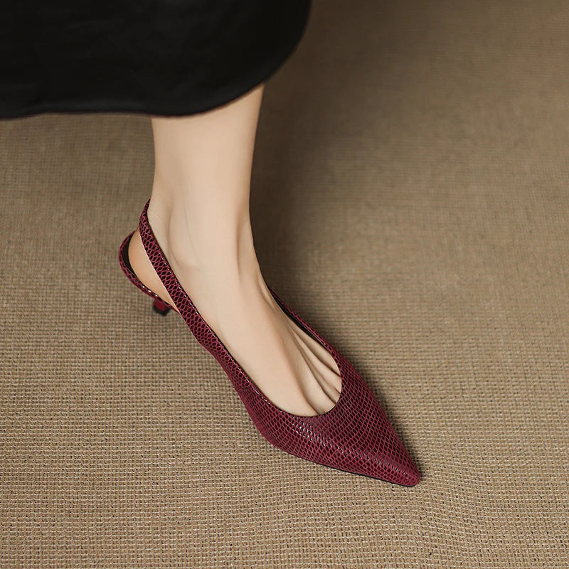 Richly crafted in snake-embossed genuine leather, these refined slingbacks offer a comfortable fit and adjustable buckle closure, providing timeless versatility with a fashion-forward edge.